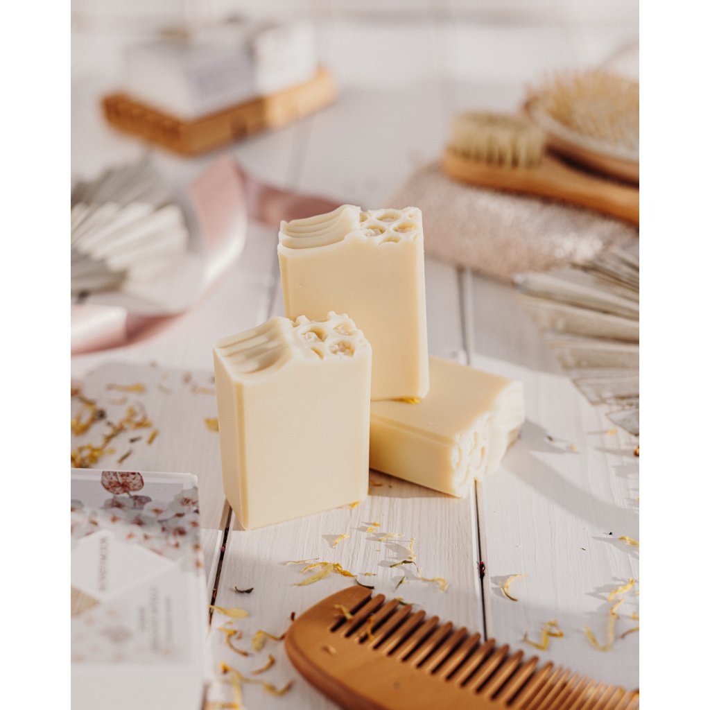Receptura založená na pečujících rostlinných olejích a máslech, jako je mandlový olej a bambucké máslo, zaručuje jemné mytí bez narušení ochranné kožní bariéry, a tím podporuje vlastní hydrataci pokožky. Mýdlo je obohaceno laktátem sodným, který vykazuje silný hydratační účinek. Přirozeně obsahuje také glycerin, který zamezuje ztrátě vody z pokožky. Silný heřmánkový výluh a macerát v mandlovém oleji nejenže dodává mýdlu překrásnou bylinkovou vůni, ale také zmírňuje projevy podráždění, zklidňuje zanícení a regeneruje, mírní začervenání a tonizuje. Lanolin zadržuje vlhkost v pokožce a poskytuje jí ochranu a hydrataci. Med dodává mýdlu bohatou krémovou pěnu, působí hojivě a regeneruje.