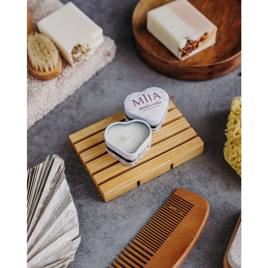 Masážní svíčka v plechovém srdíčku 23 ml s relaxační vůní černé růže a jasmínu.
