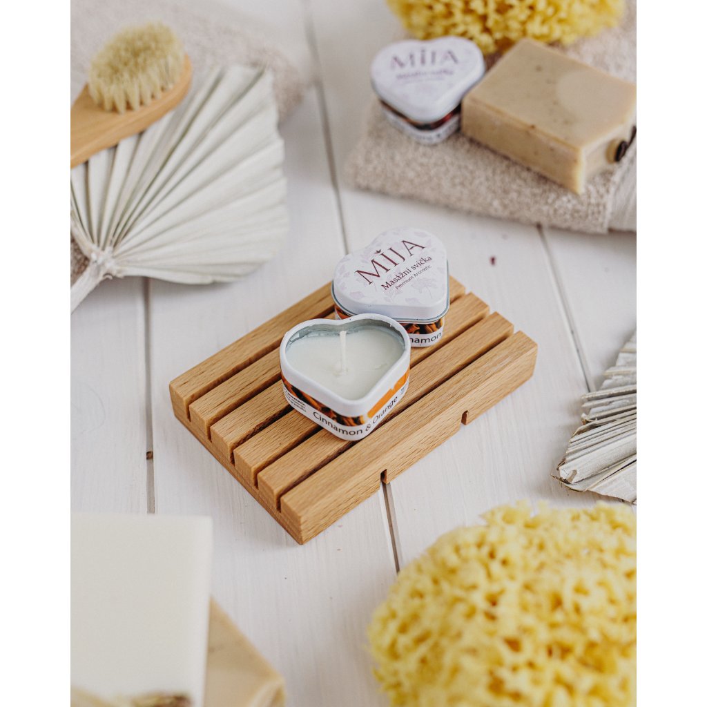 Masážní svíčka v plechovém srdíčku 23 ml s afrodiziakální vůní skořice a pomeranče.